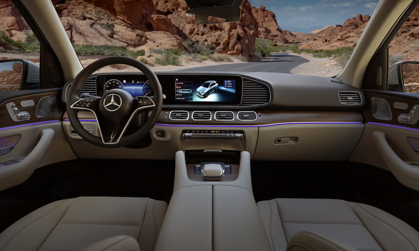 Every Mercedes-Benz interior is a sanctuary of thoughtful design, and these hybrids are no exception. The GLE 450e greets you with twin 12.3-inch digital displays, subtle 64-color ambient lighting, and richly upholstered surfaces. The cabin's spaciousness and attention to detail make it ideal for long, luxurious travel. Optional enhancements include AMG Line styling, illuminated running boards, and heated armrests, adding an extra air of luxury.